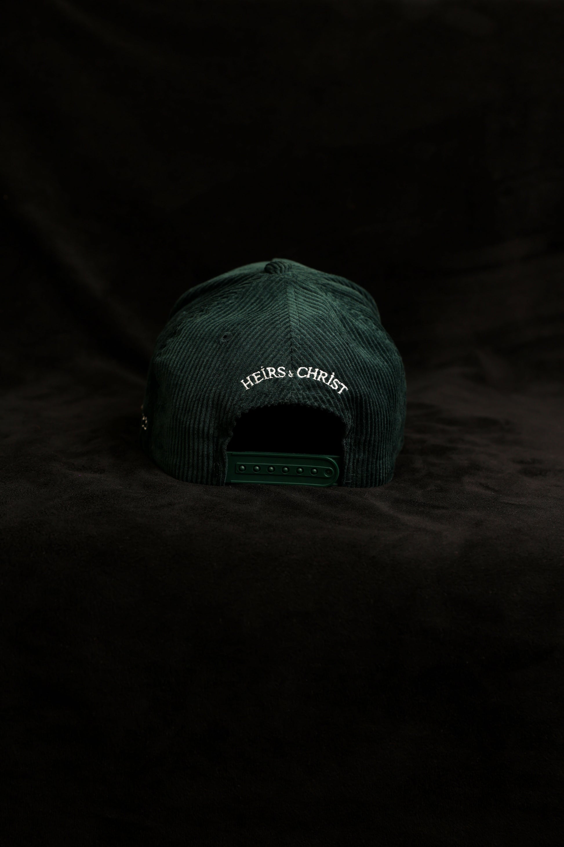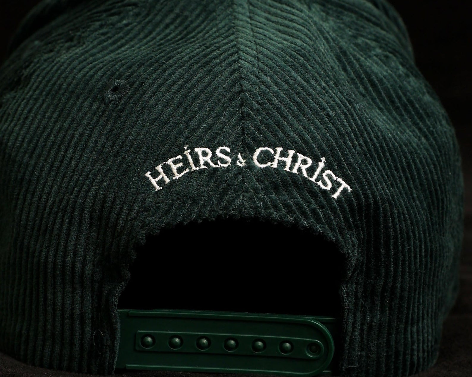 The Heirs & Christ HC Baseball Hat in Pine Green corduroy features an embroidered White HC logo at the front, “Heirs & Christ” lettering at the back, and an embroidered “Established ’23” detail on the side. Crafted with a textured wool finish for added warmth and depth, this structured cap is designed with an adjustable strap closure for a comfortable, unisex fit.