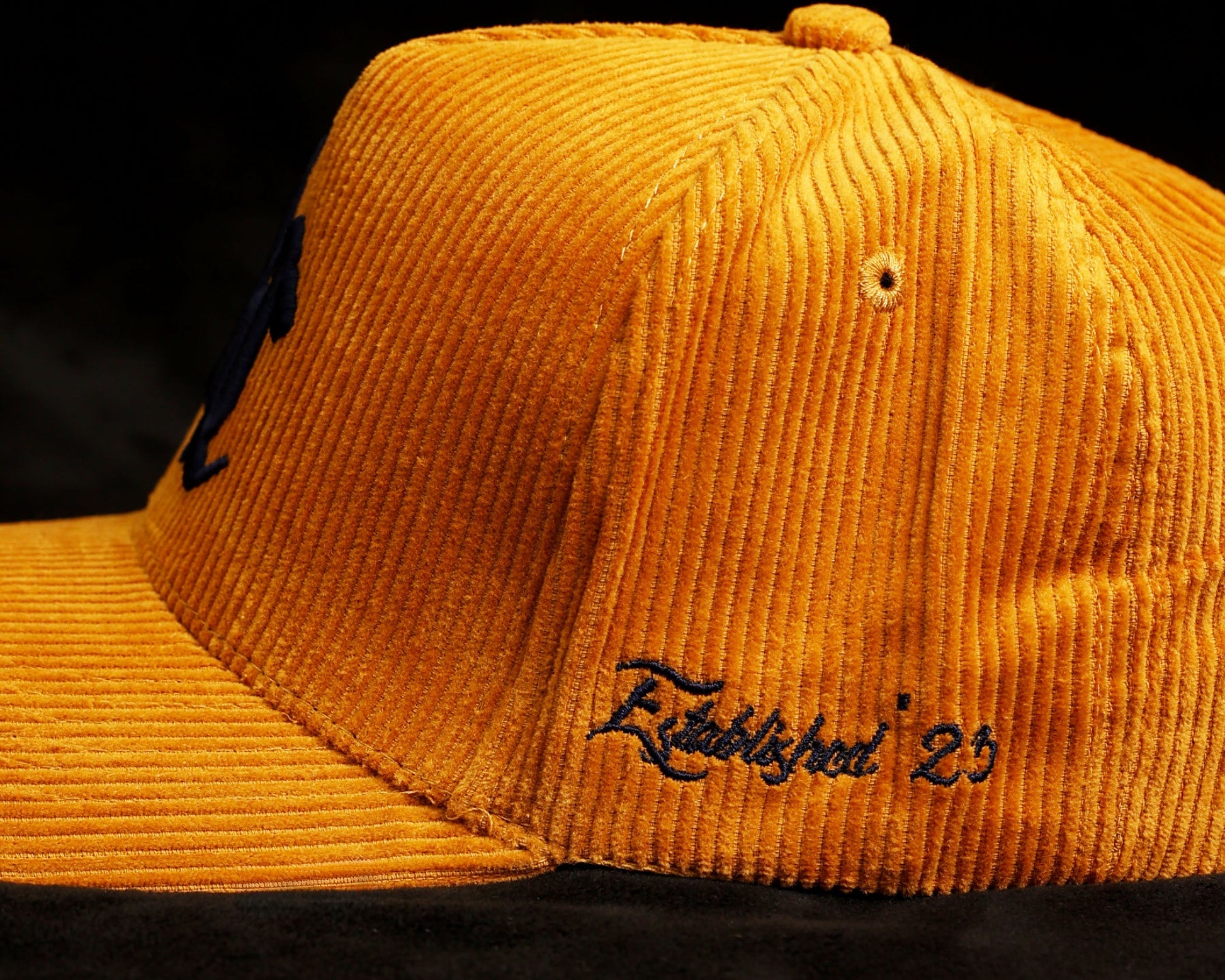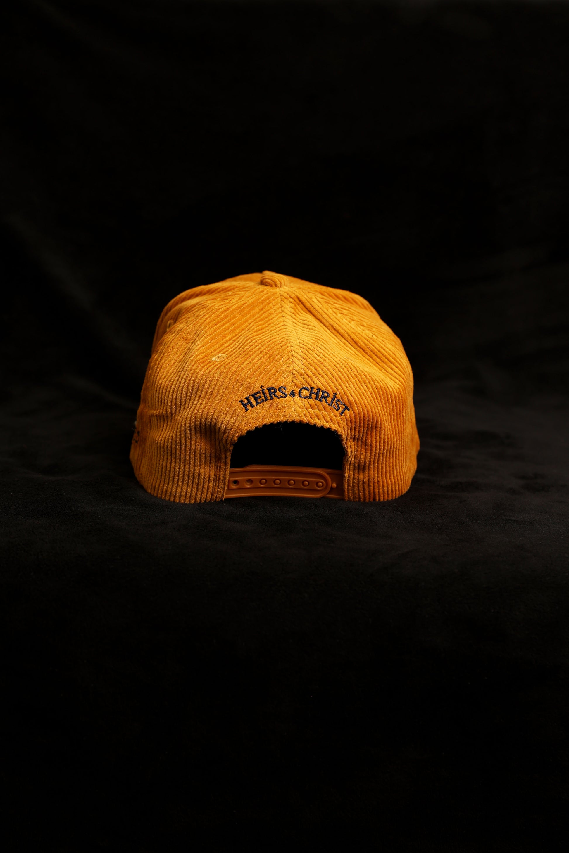 The Heirs & Christ HC Baseball Hat in Yellow Gold corduroy features an embroidered Navy Blue HC logo at the front, “Heirs & Christ” lettering at the back, and an embroidered “Established ’23” detail on the side. Crafted with a textured wool finish for added warmth and depth, this structured cap is designed with an adjustable strap closure for a comfortable, unisex fit.