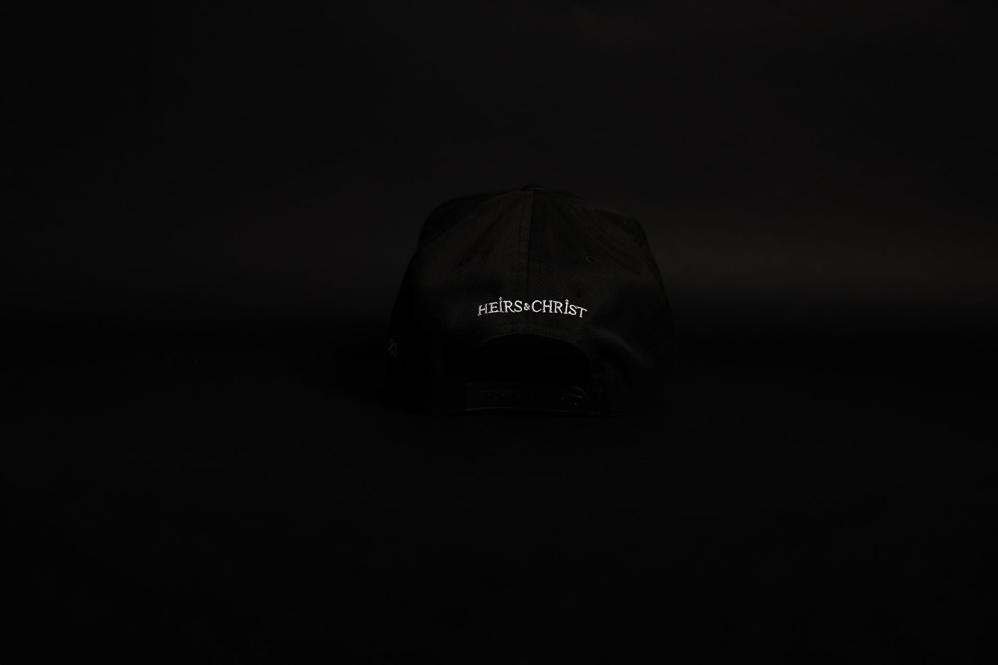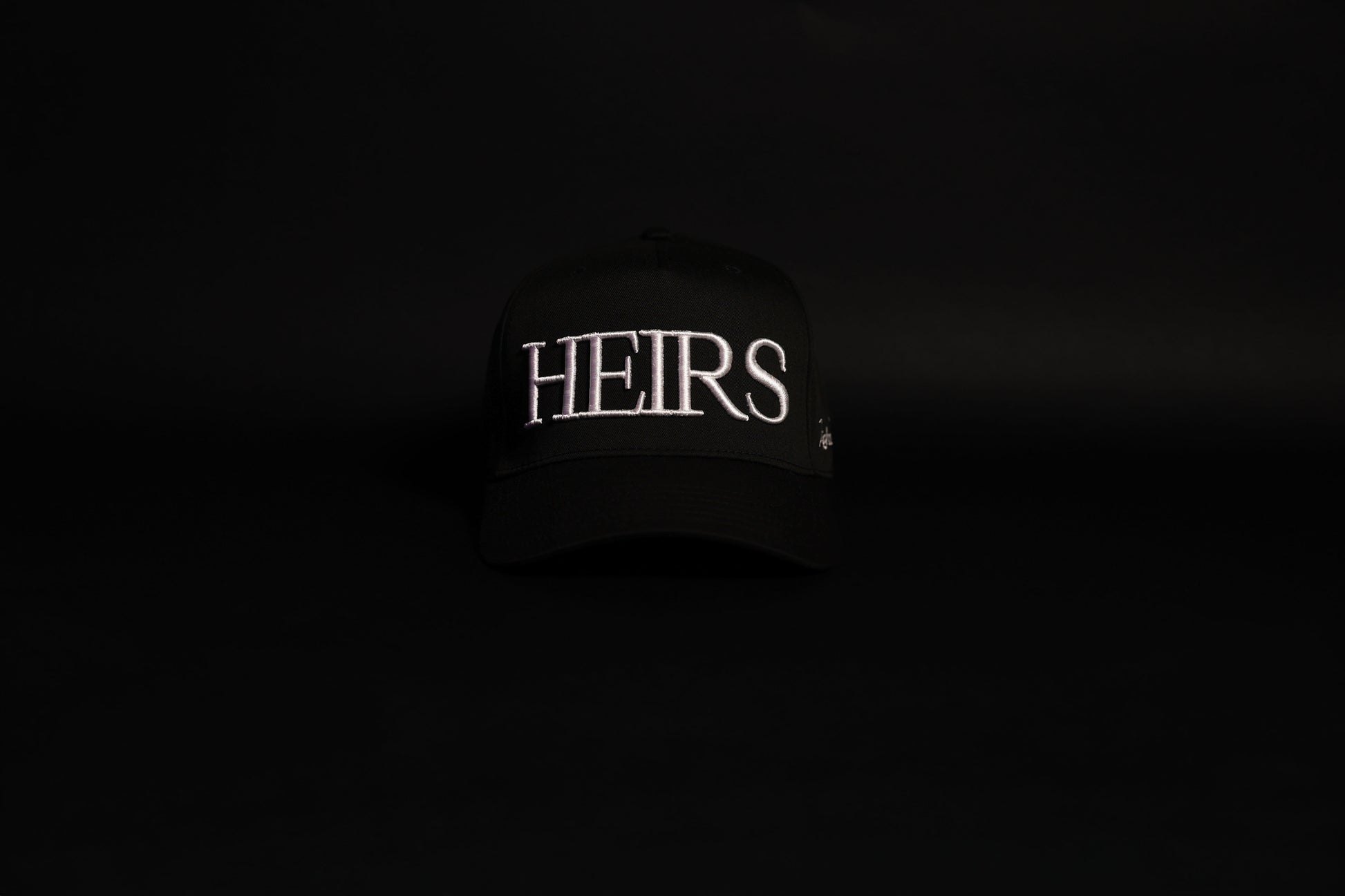 The HEIRS & CHRIST 'HEIRS' Baseball Hat in black with white embroidery features a bold HEIRS logo across the front, “Heirs & Christ” detail at the back, and “Established 23” stitching along the side. Designed with precision embroidery and a structured crown, this premium snapback offers a clean, elevated finish and a comfortable, unisex fit.