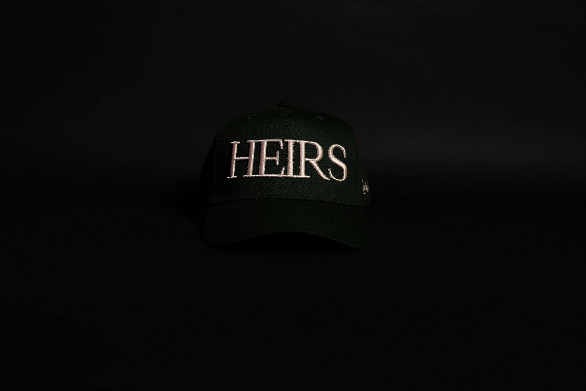 The Heirs & Christ 'Heirs' Baseball Hat in forest green with tan embroidery features the bold “HEIRS” logo across the front, “Established ‘23” detailing on the side, and “Heirs & Christ” embroidery on the back. Crafted with premium stitching and a structured crown, finished with an adjustable snapback closure for a comfortable, unisex fit.