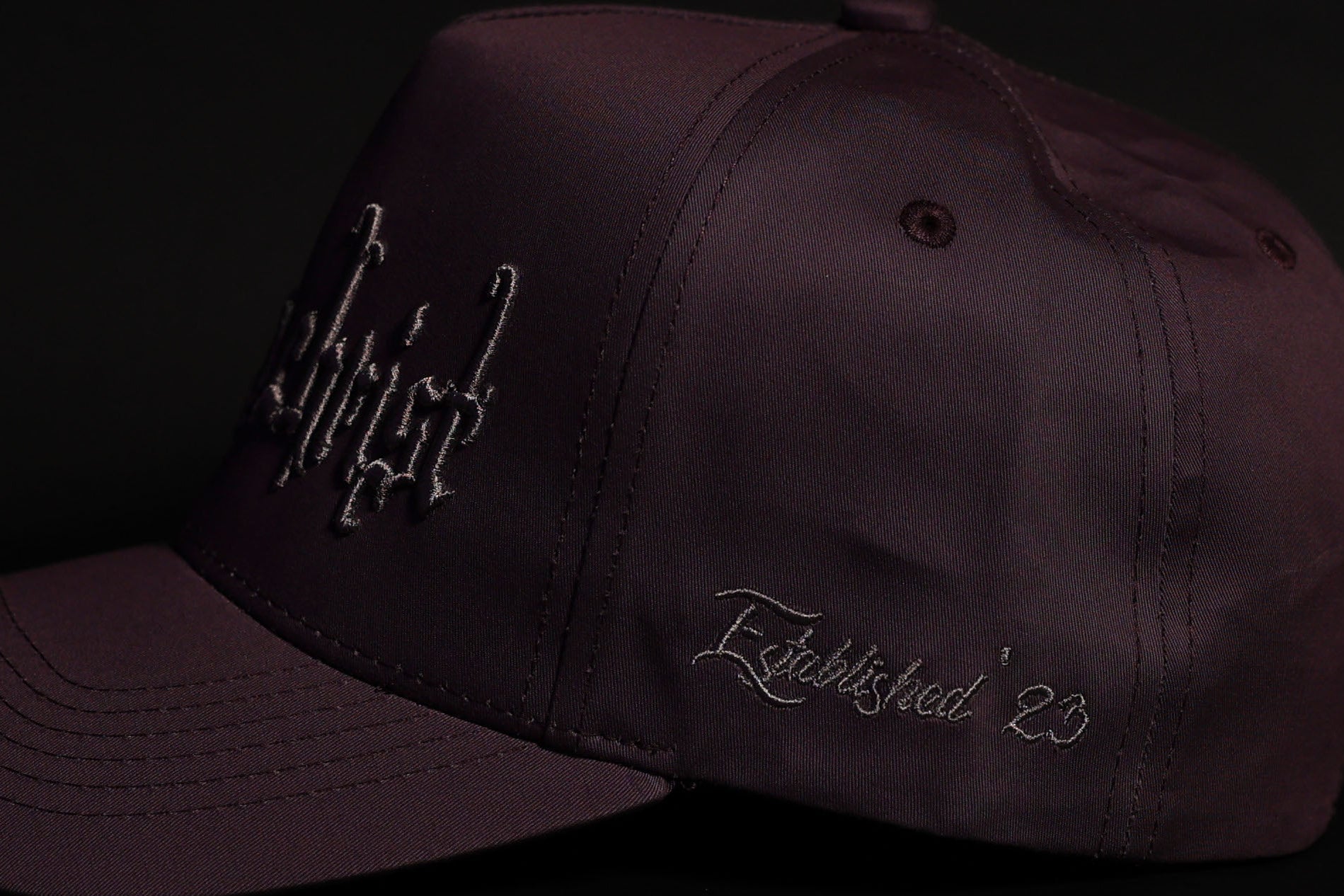 The Heirs & Christ 'Heirs x Christ' Baseball Hat in purple featuring bold gothic embroidery across the front, “Established ‘23” stitched on the side, and “Heirs & Christ” detailing on the back. Designed with precision embroidery and a structured crown, this premium snapback offers a clean, elevated finish and a comfortable, unisex fit.