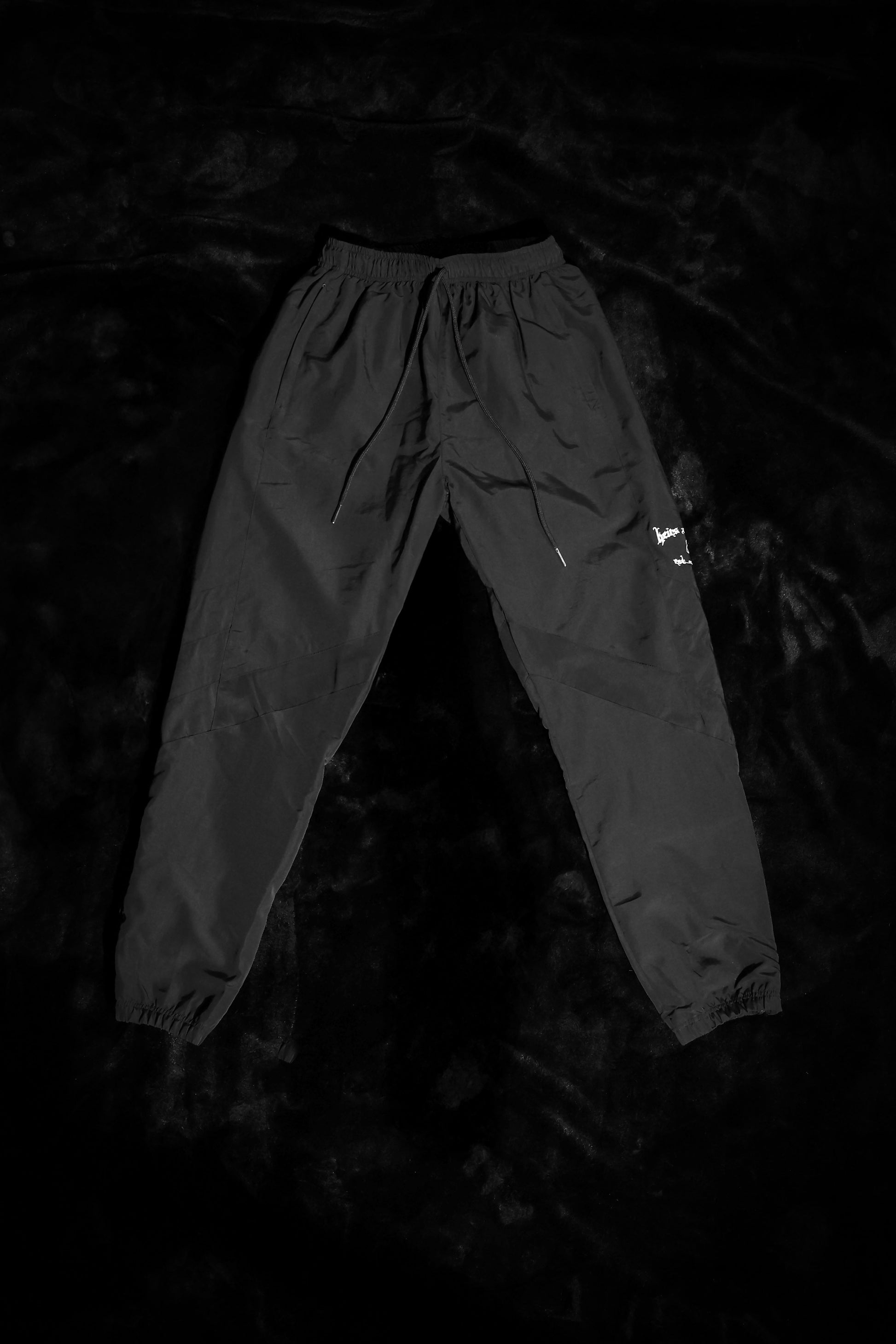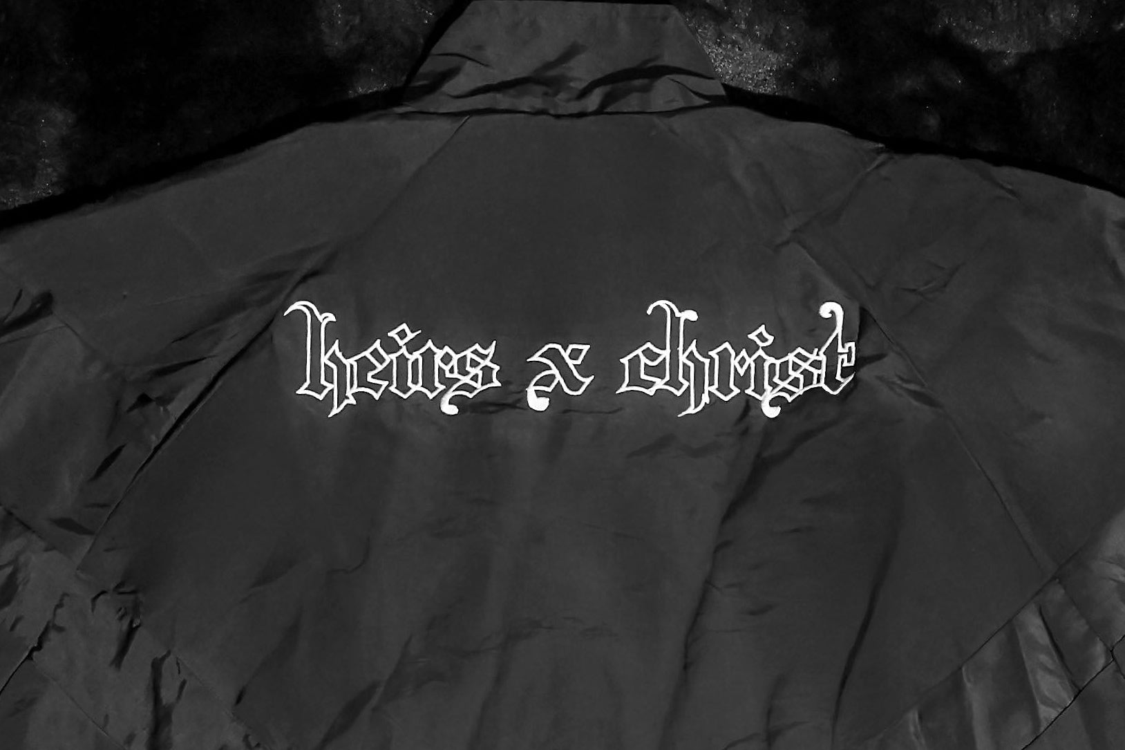 Crafted from premium lightweight nylon with a subtle sheen, this all-black set features a white HC monogram at the chest, heritage “Heirs x Christ” script across the back, and matching branded joggers for a sharp, unified look. Elastic cuffs, a full zip jacket, and an adjustable drawstring waistband deliver a structured yet comfortable fit.