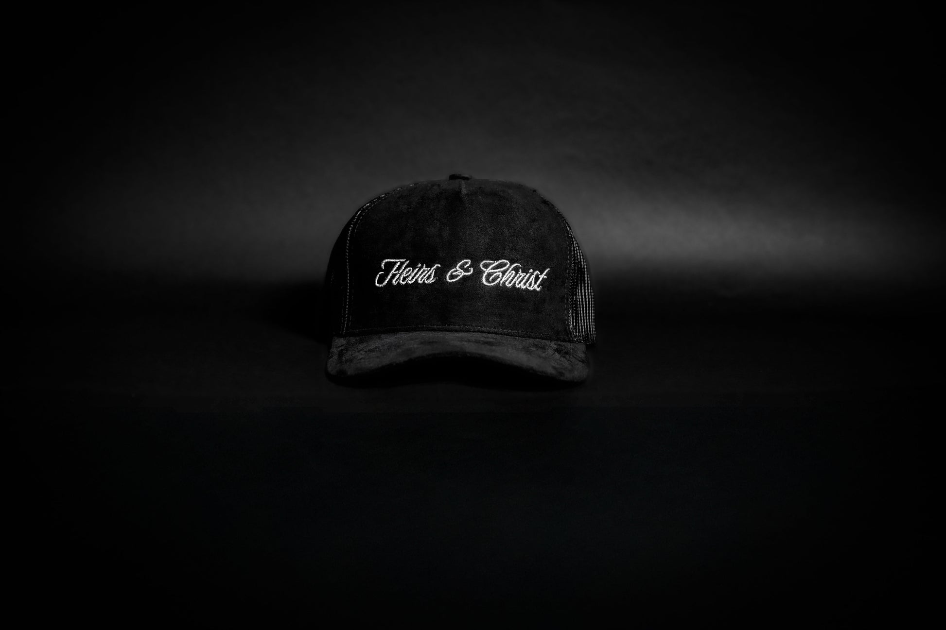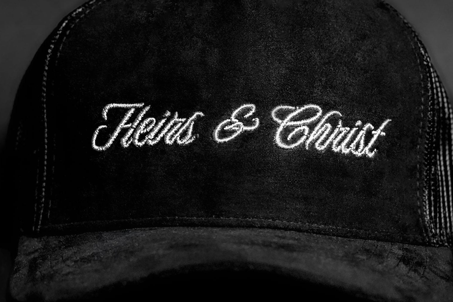 The Heirs & Christ Suede Trucker Hat in Black Suede with tonal Gray embroidery features the “Heirs & Christ” cursive logo across the front in a sleek monochrome design. Made with premium black suede and a mesh back for everyday breathability, this hat blends subtle style with purpose. Crafted with premium stitching and a structured crown, finished with an adjustable snapback closure for a comfortable, unisex fit.