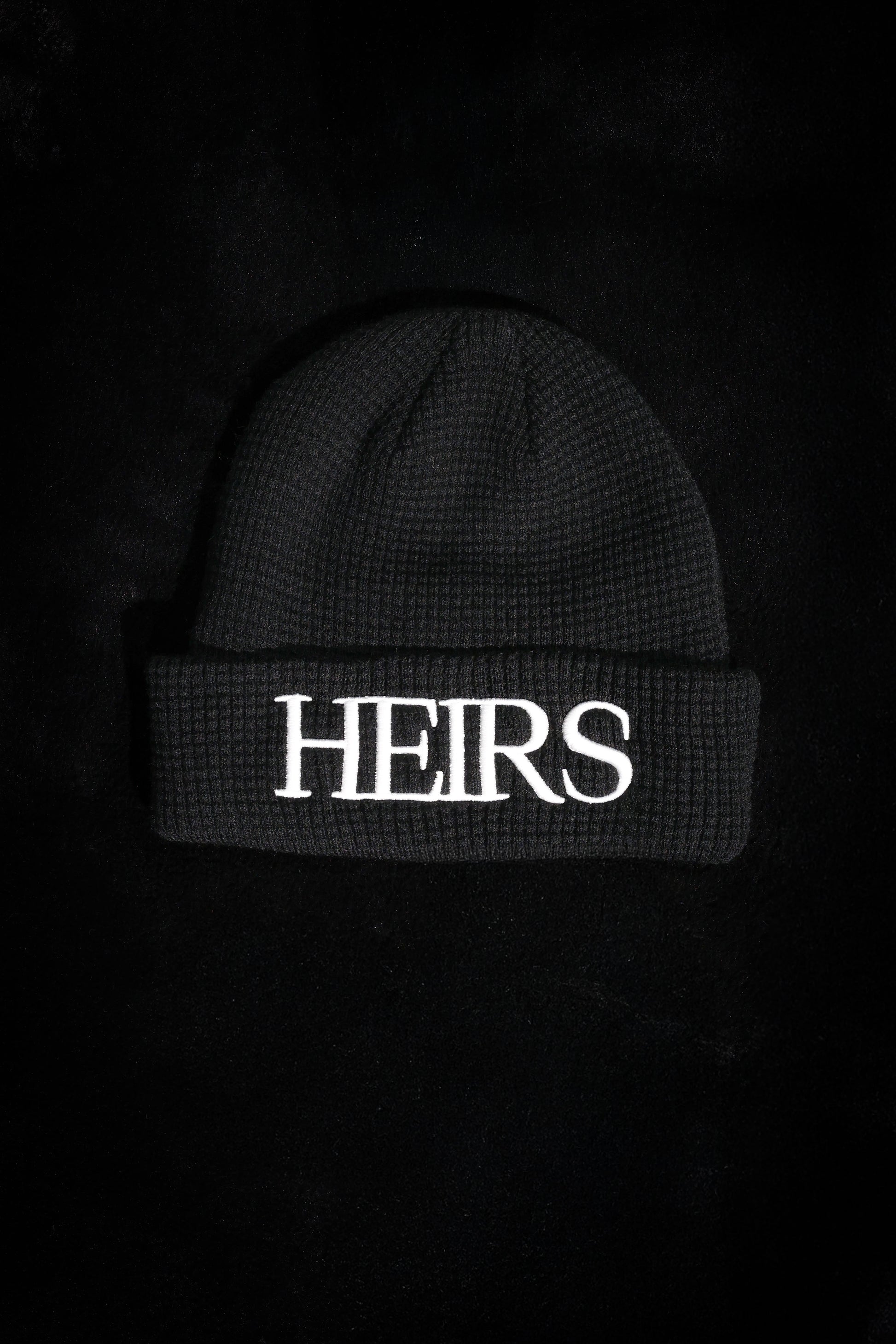 The HEIRS & CHRIST “HEIRS / HC” Knit Crown in Midnight Black features bold embroidered HEIRS lettering across the front and an embroidered HC monogram at the back, offering a refined, double-sided expression of the brand. Crafted from a premium waffle knit with a soft yet structured feel, this crown delivers warmth, comfort, and an elevated unisex fit.