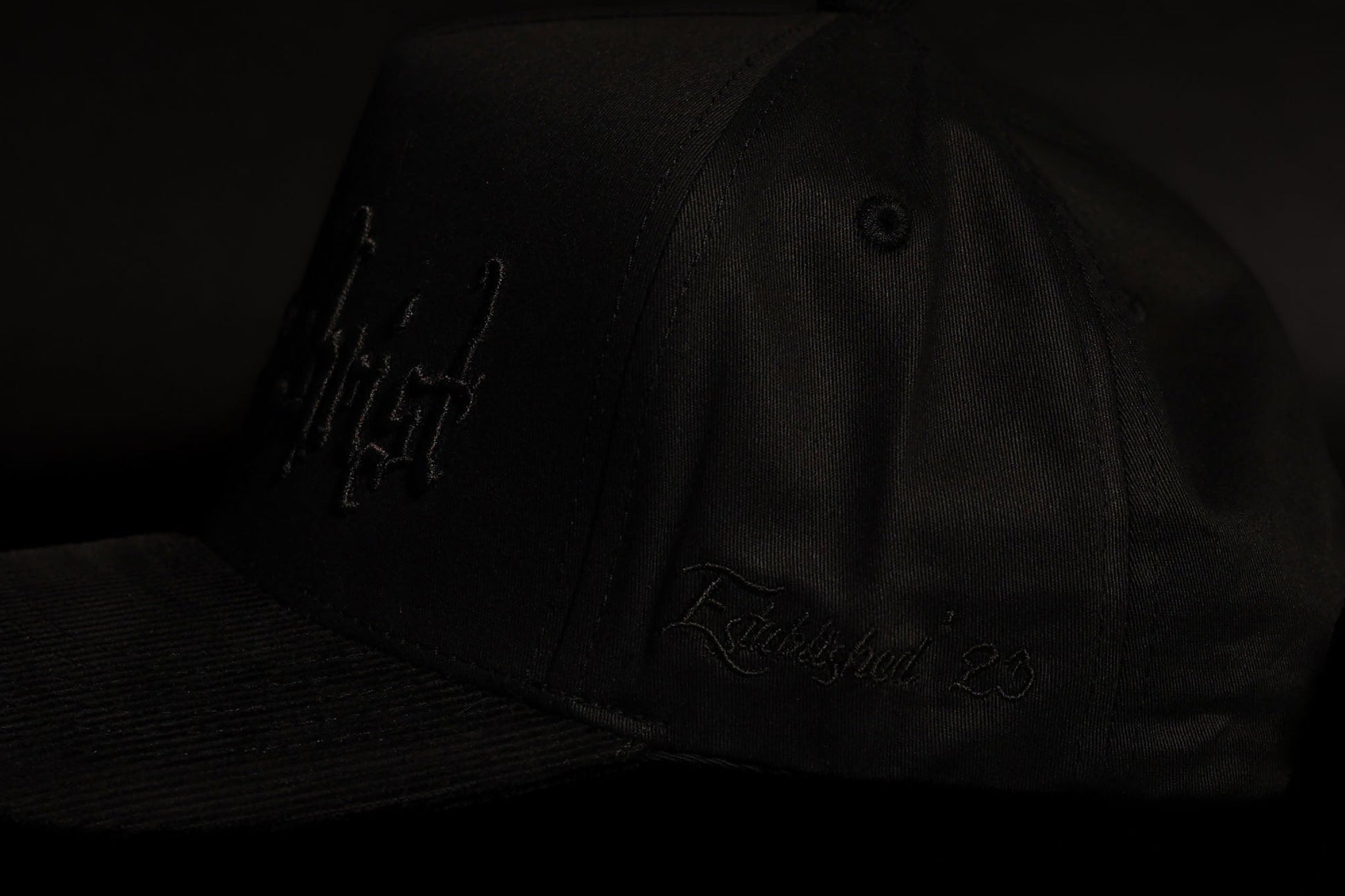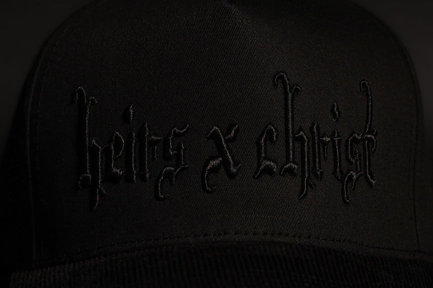 The Heirs & Christ 'Heirs x Christ' Baseball Hat in black featuring bold gothic embroidery across the front, “Established ‘23” stitched on the side, and red “Heirs & Christ” detailing on the back. Designed with precision embroidery and a structured crown, this premium snapback offers a clean, elevated finish and a comfortable, unisex fit.