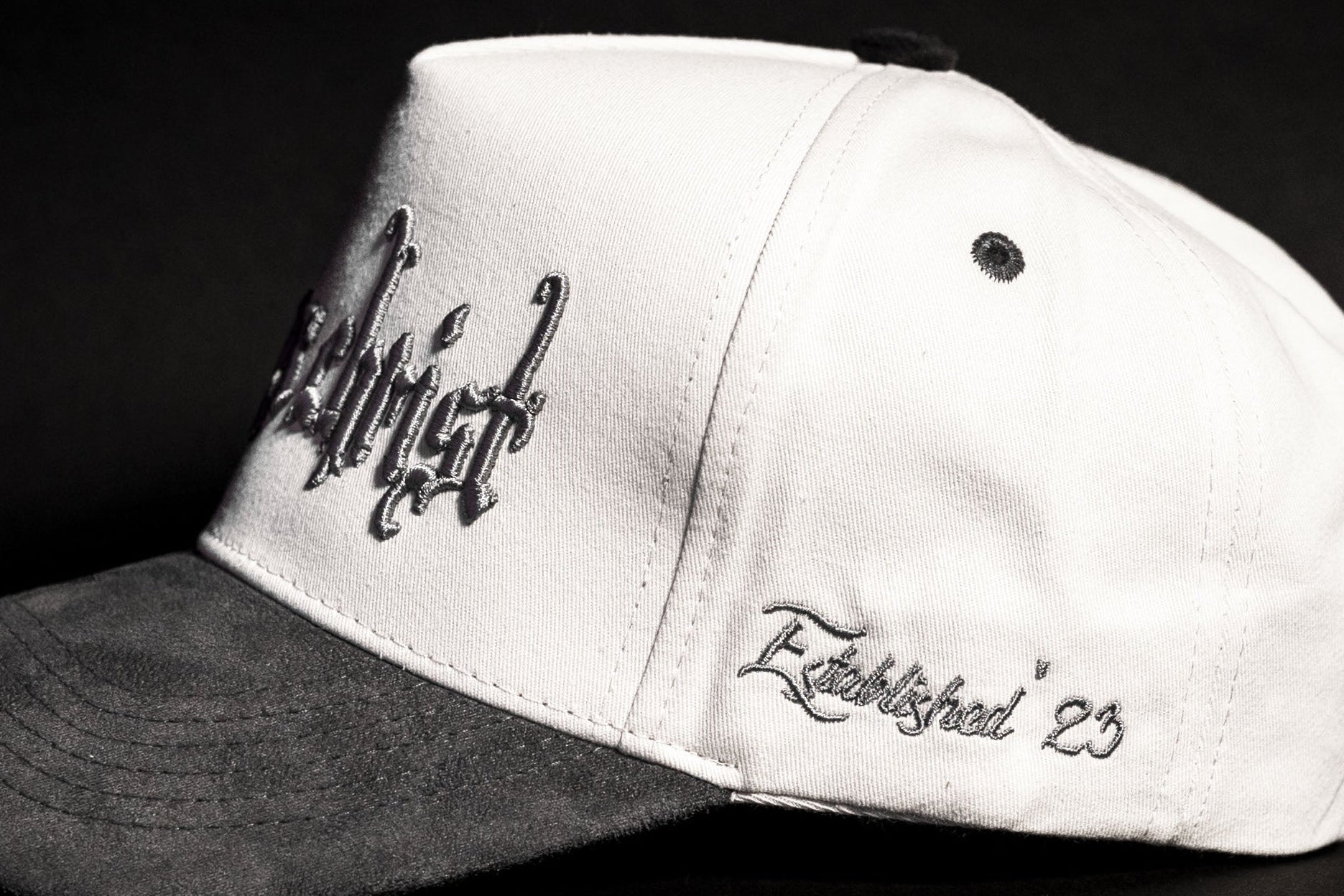 The Heirs & Christ 'Heirs x Christ' Baseball Hat in Cream with a Dark Gray suede brim features bold gothic embroidery across the front, “Established ‘23” stitched on the side, and “Heirs & Christ” detailing on the back. Designed with a structured crown and adjustable snapback, this premium two-tone cap blends streetwear influence with timeless faith-inspired style.